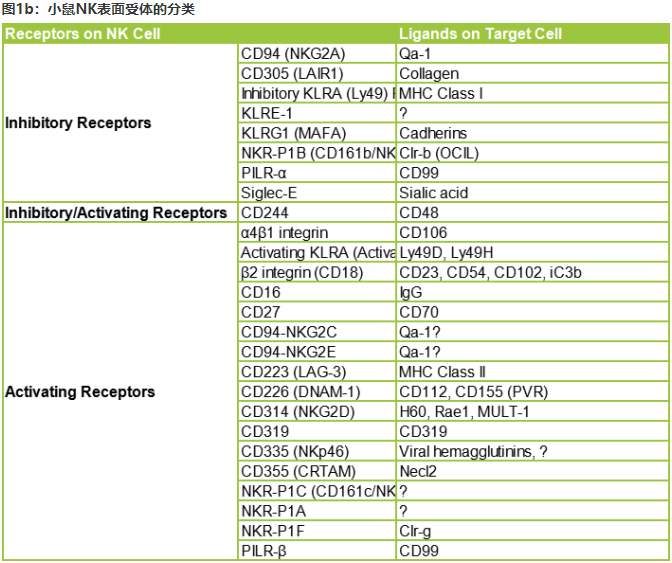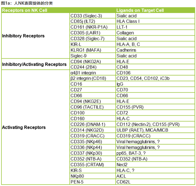 NK细胞的功能由多种细胞表面受体控制,这些受体要么具有激活的细胞毒性功能,要么具有免疫调节作用1,这些受体分类见下表1a和1b。NK细胞的细胞毒性受激活和抑制信号相互作用的调节,抑制性受体通过识别自身MHC-I类分子来阻止NK细胞的激活。