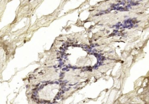 多聚甲醛固定,石蜡包埋(人乳腺癌);用柠檬酸钠缓冲液(pH6.0)煮沸15min后获得抗原;用3%过氧化氢阻断内源性过氧化物酶20分钟;阻断缓冲液(正常山羊血清)37℃30min;用BRCA1抗体孵育。未结合的多克隆抗体在1:200在4°C下过夜,然后根据SP试剂盒(兔子)说明和DAB染色进行操作。
